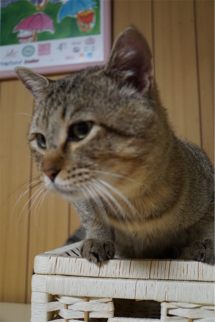なぜか、この籠の上が好きで上にのってこうなるので、中に物を入れるのはあきらめました。